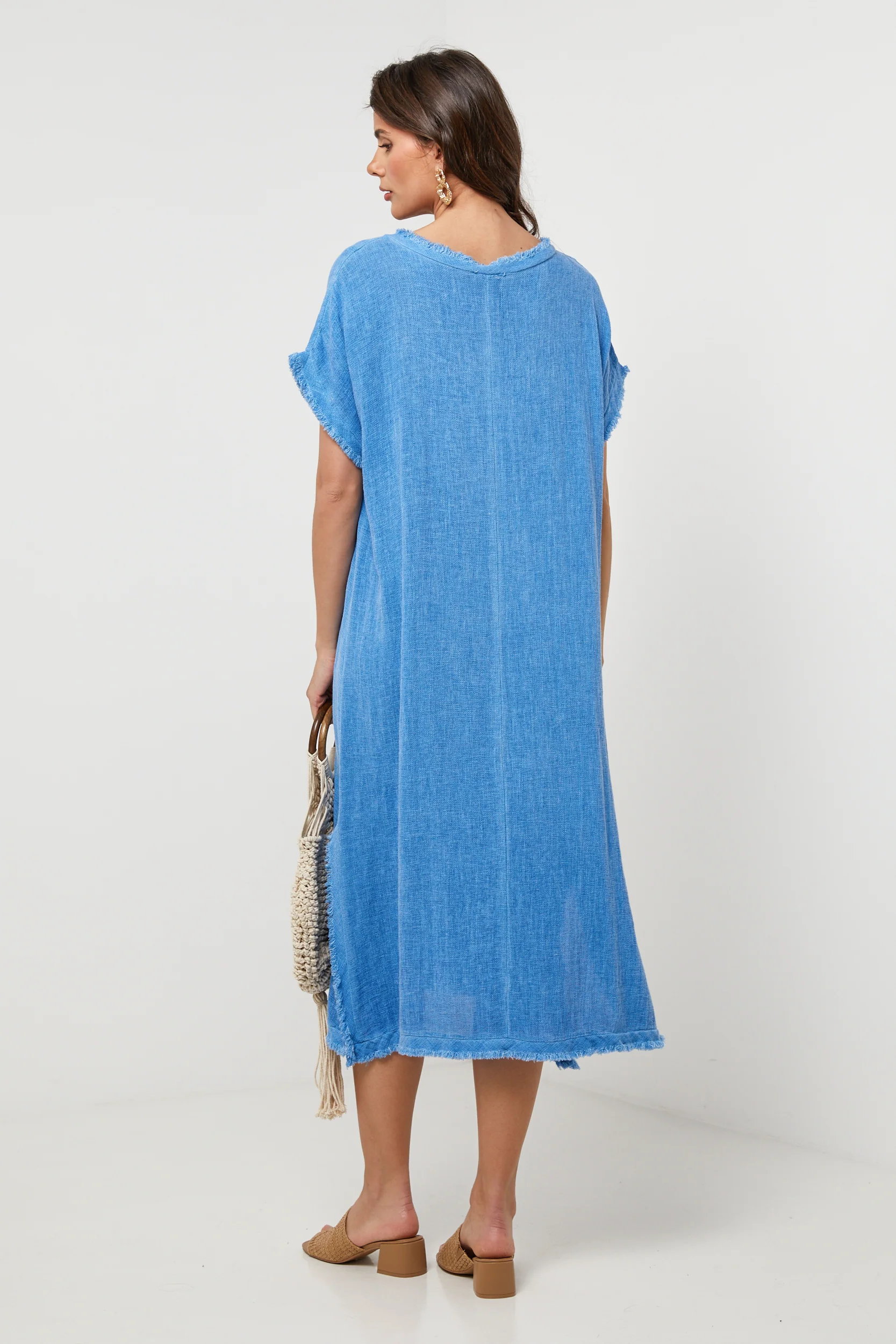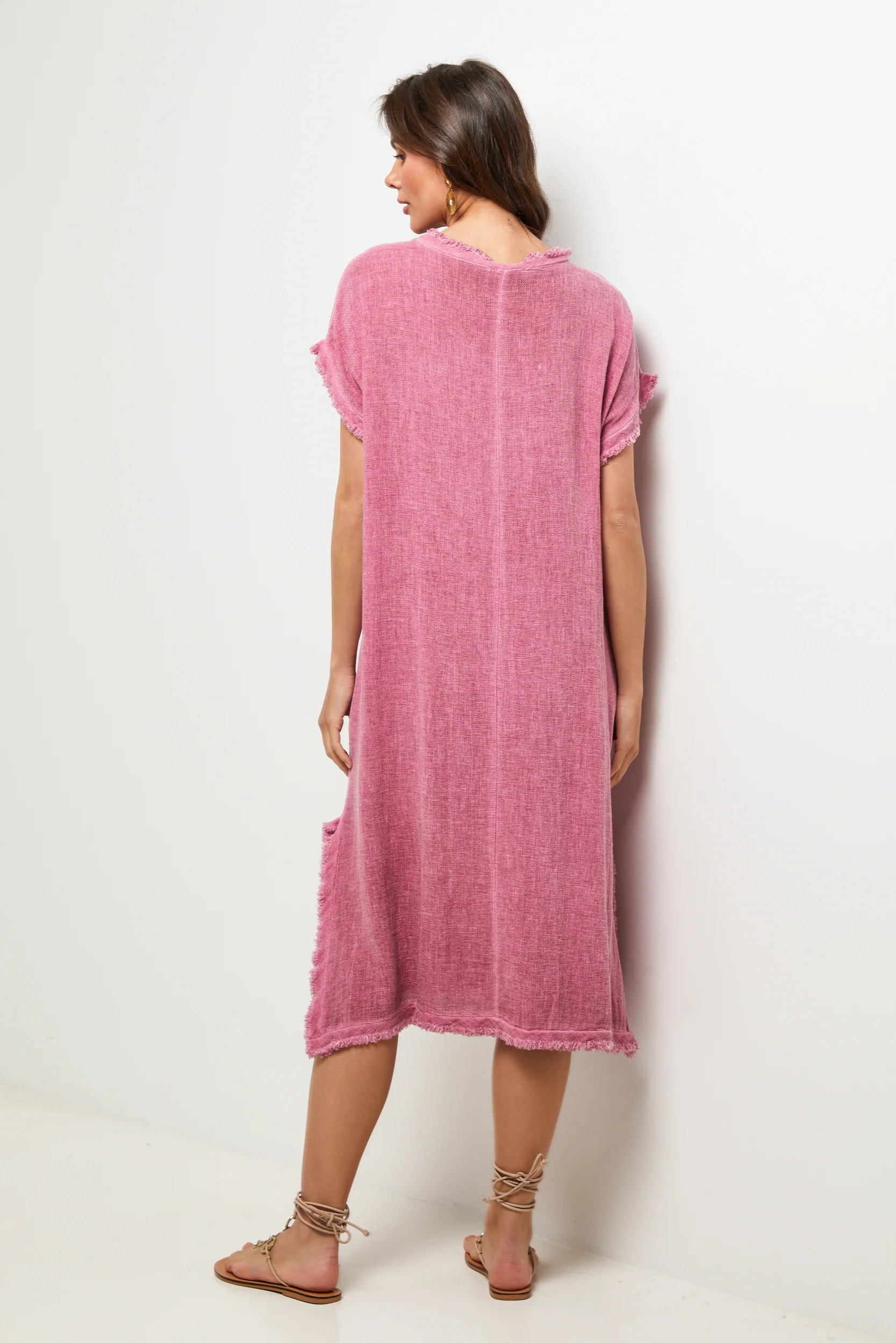 Robe longue loose à manches courtes, col V à détail effiléLavage en machine, en dessous de 30 ° C50% Lin 50% Coton
