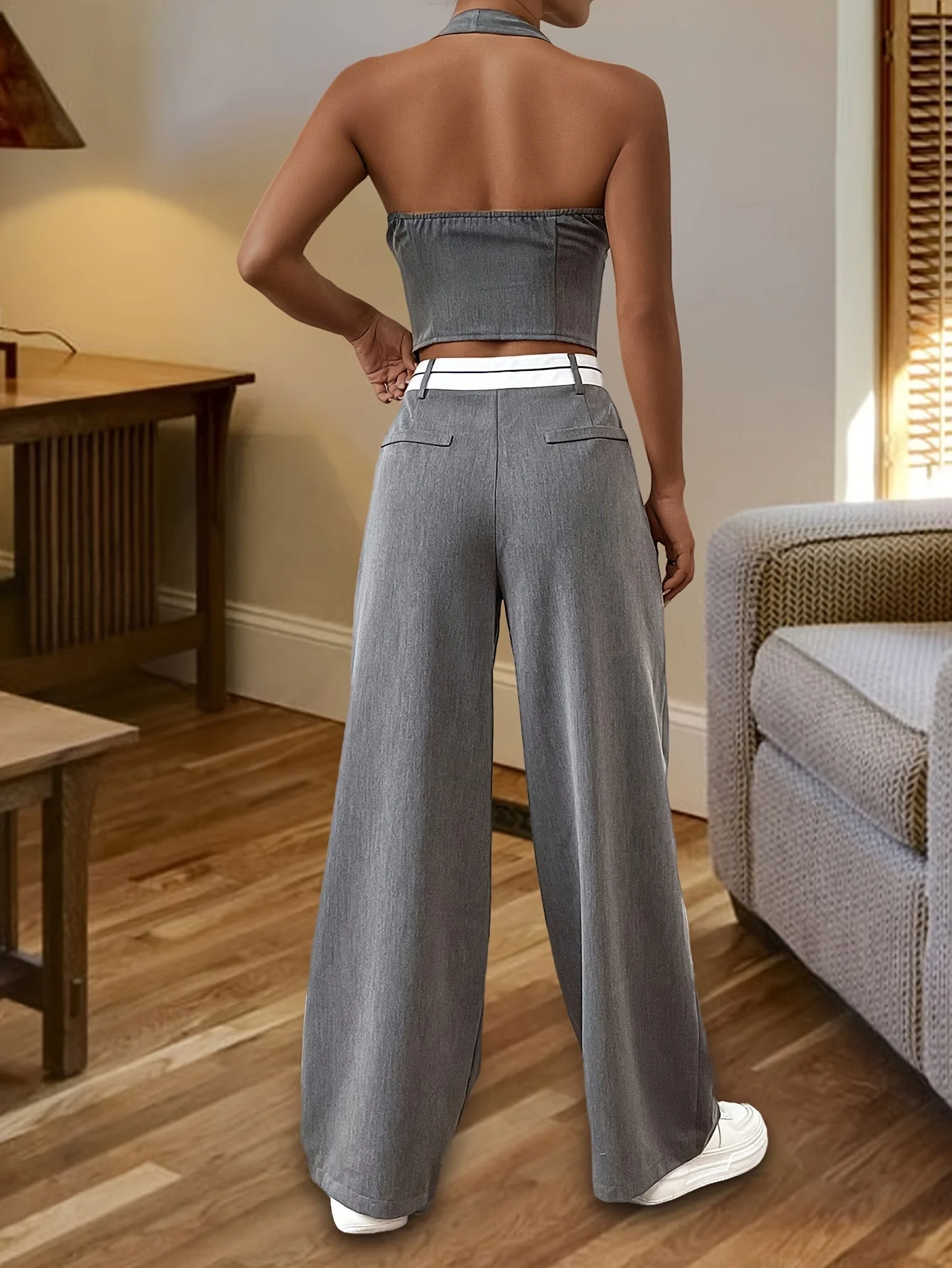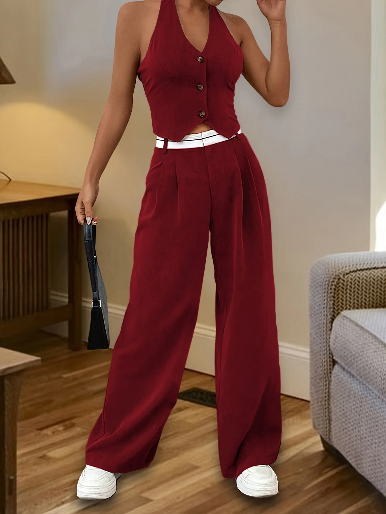 Cet ensemble deux pièces de couleur unie se compose d’un haut élégant à col halter avec boutons sur le devant et d’un pantalon large, créant une silhouette sophistiquée et chic.