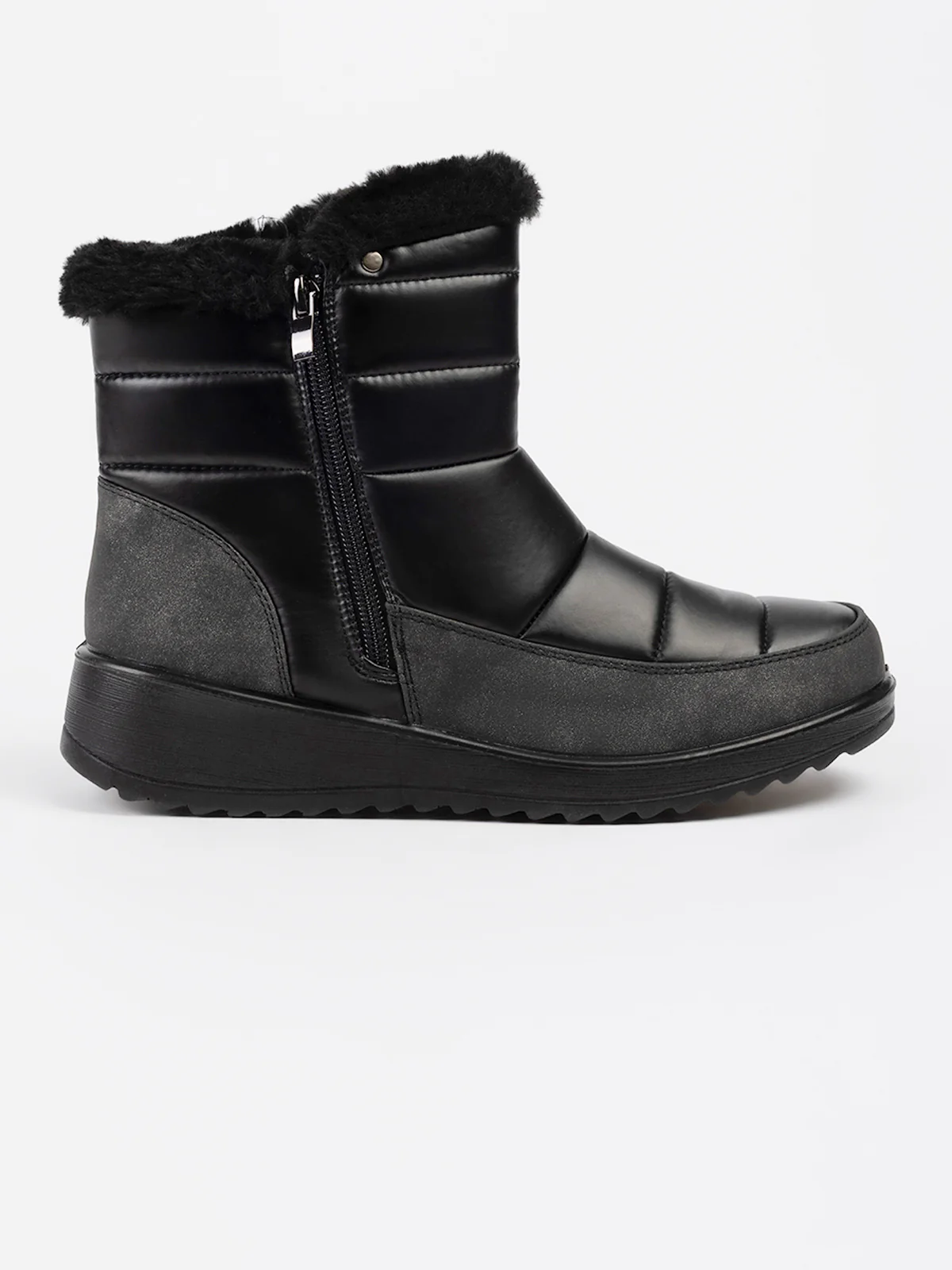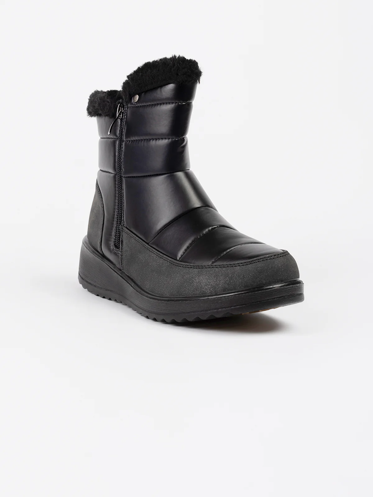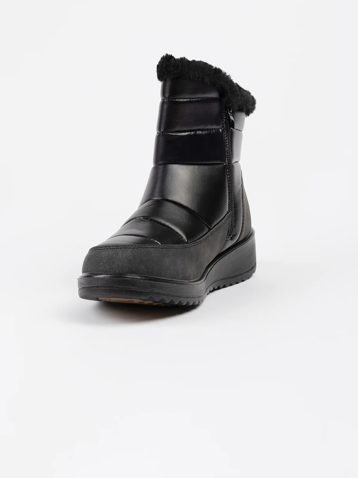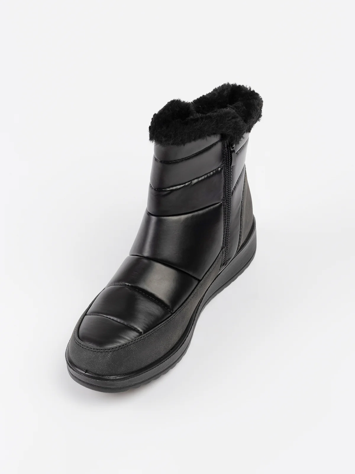 Bottes d’hiver en textile matelassé à surpiqûres horizontales, rehaussées d’un revers en fausse fourrure. Elles sont dotées d’un talon compensé et d’une fermeture zippée latérale facilitant l’enfilage.