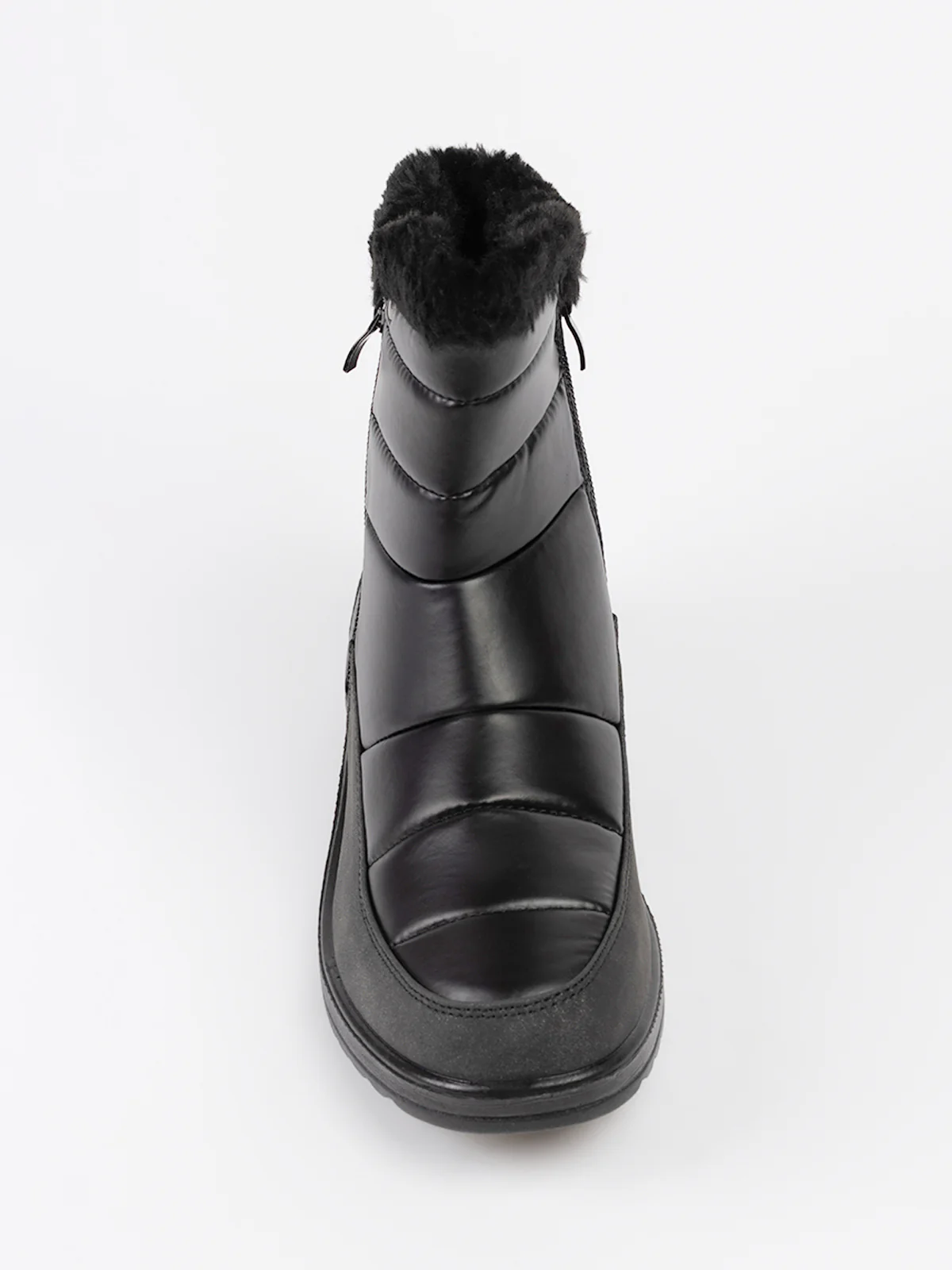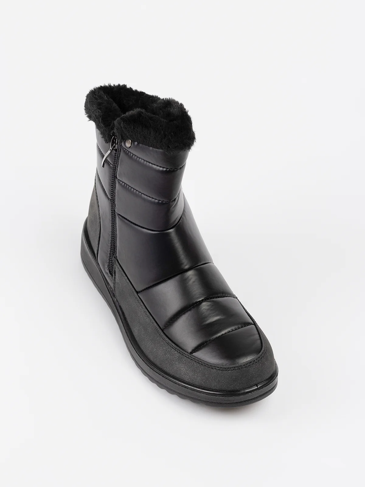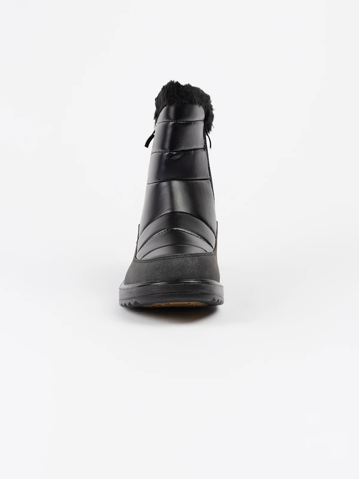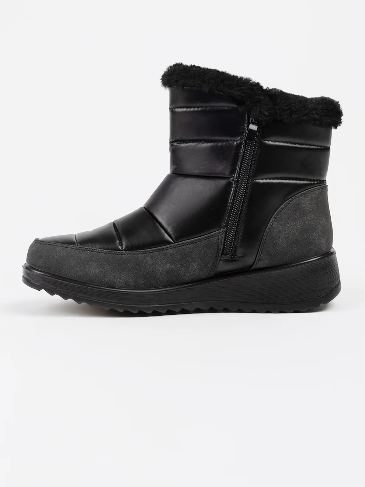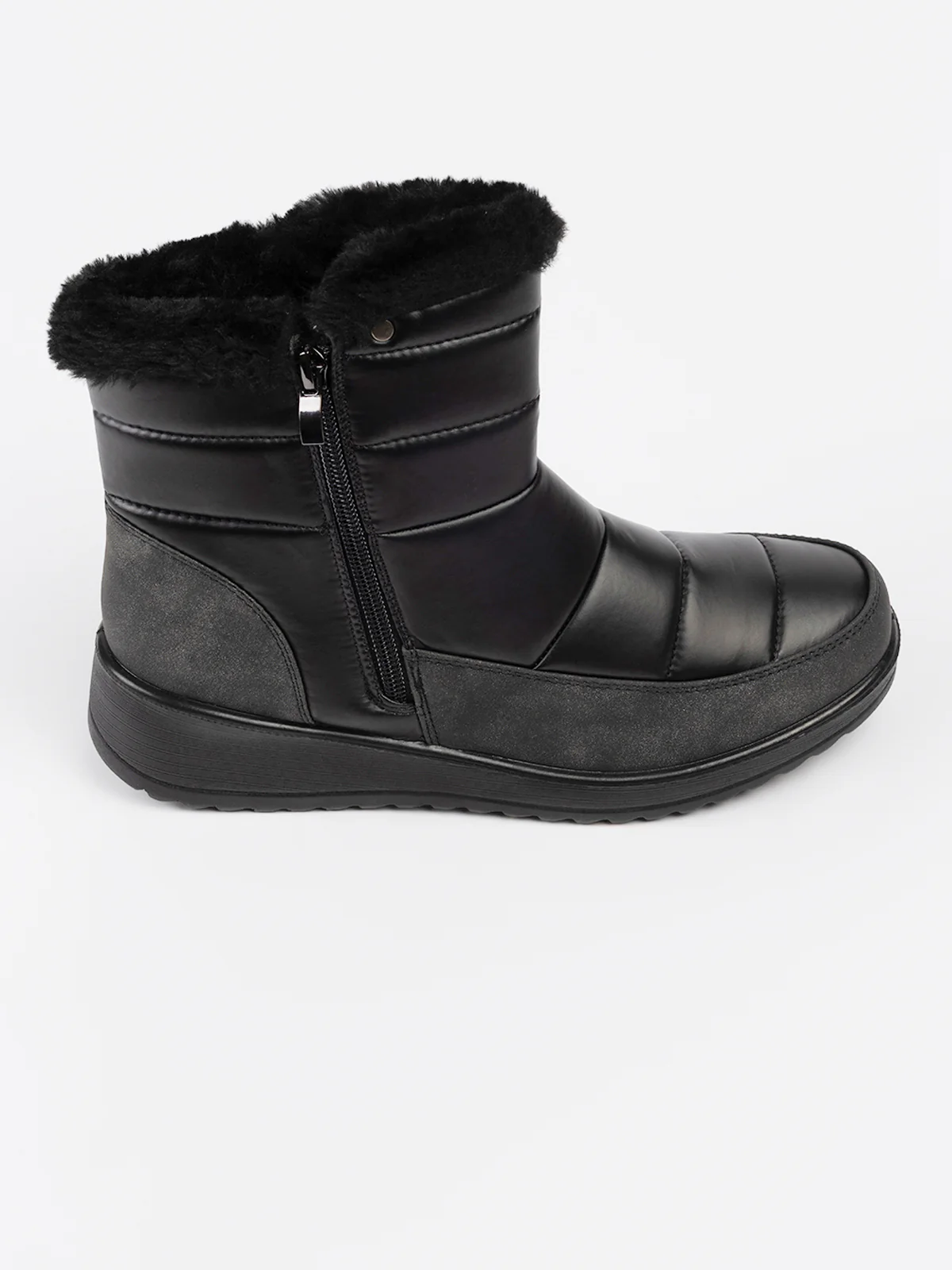 Bottes d’hiver en textile matelassé à surpiqûres horizontales, rehaussées d’un revers en fausse fourrure. Elles sont dotées d’un talon compensé et d’une fermeture zippée latérale facilitant l’enfilage.
