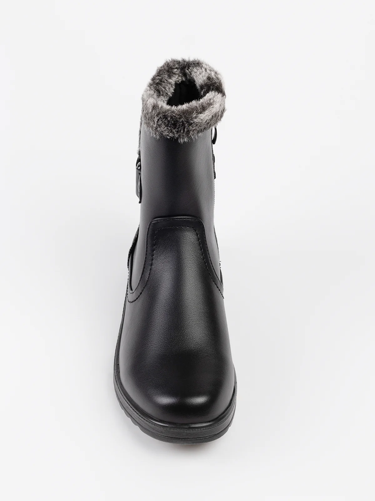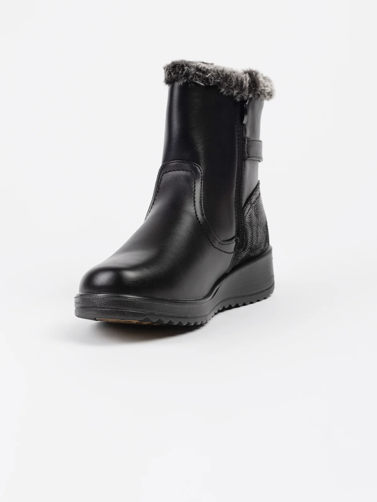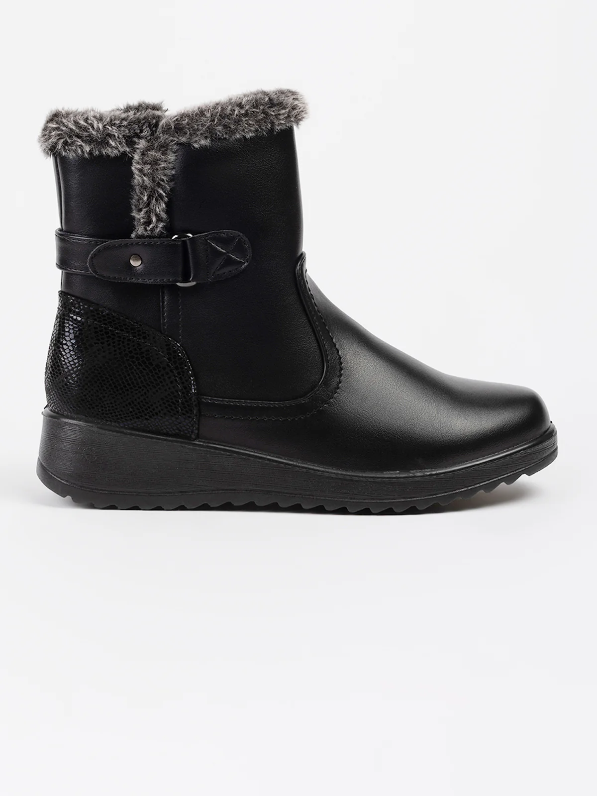 Bottes d’hiver à talons compensés, dotées d’un revers en fausse fourrure, d’une fermeture zippée latérale et d’un empiècement arrière texturé.