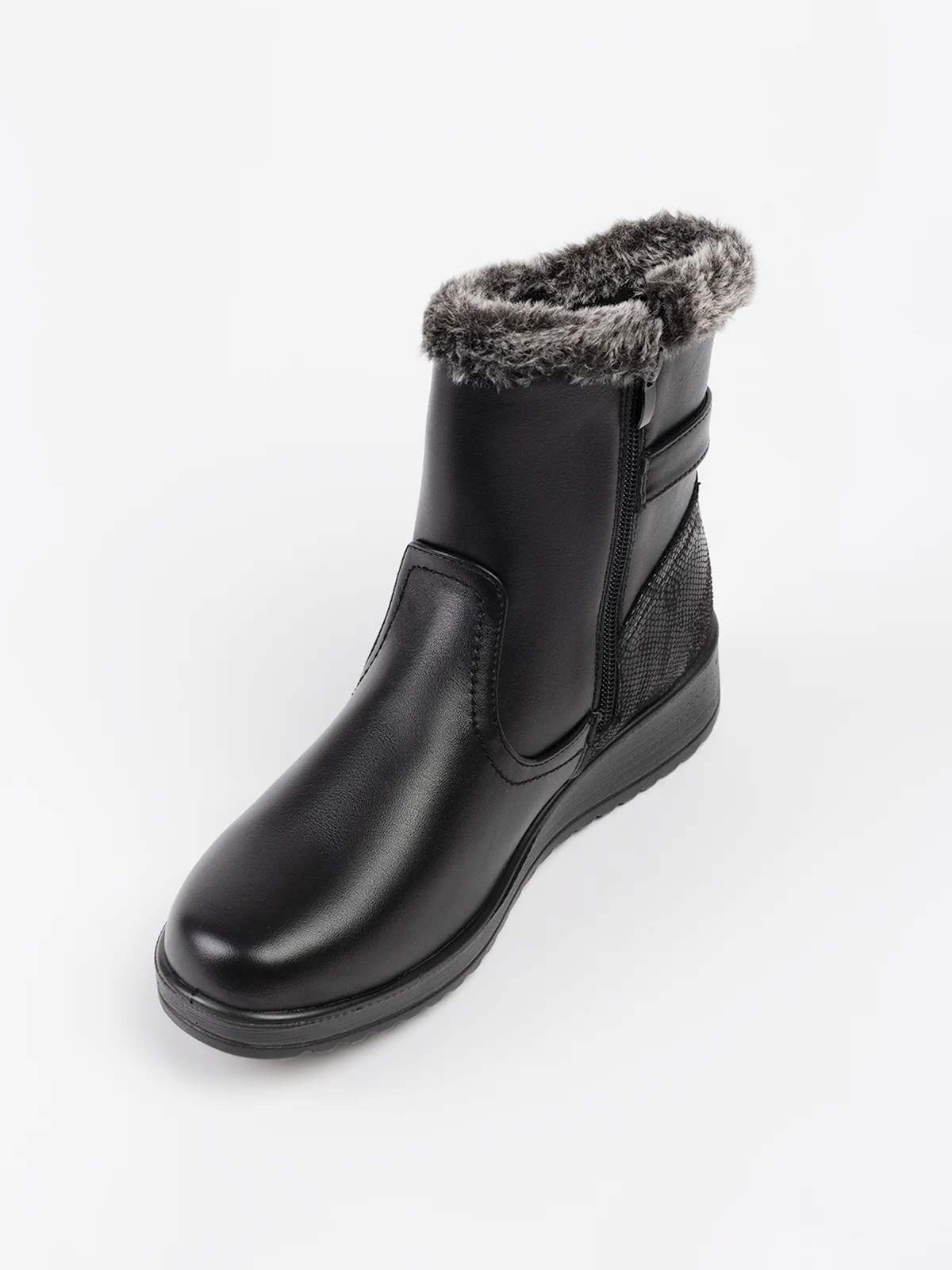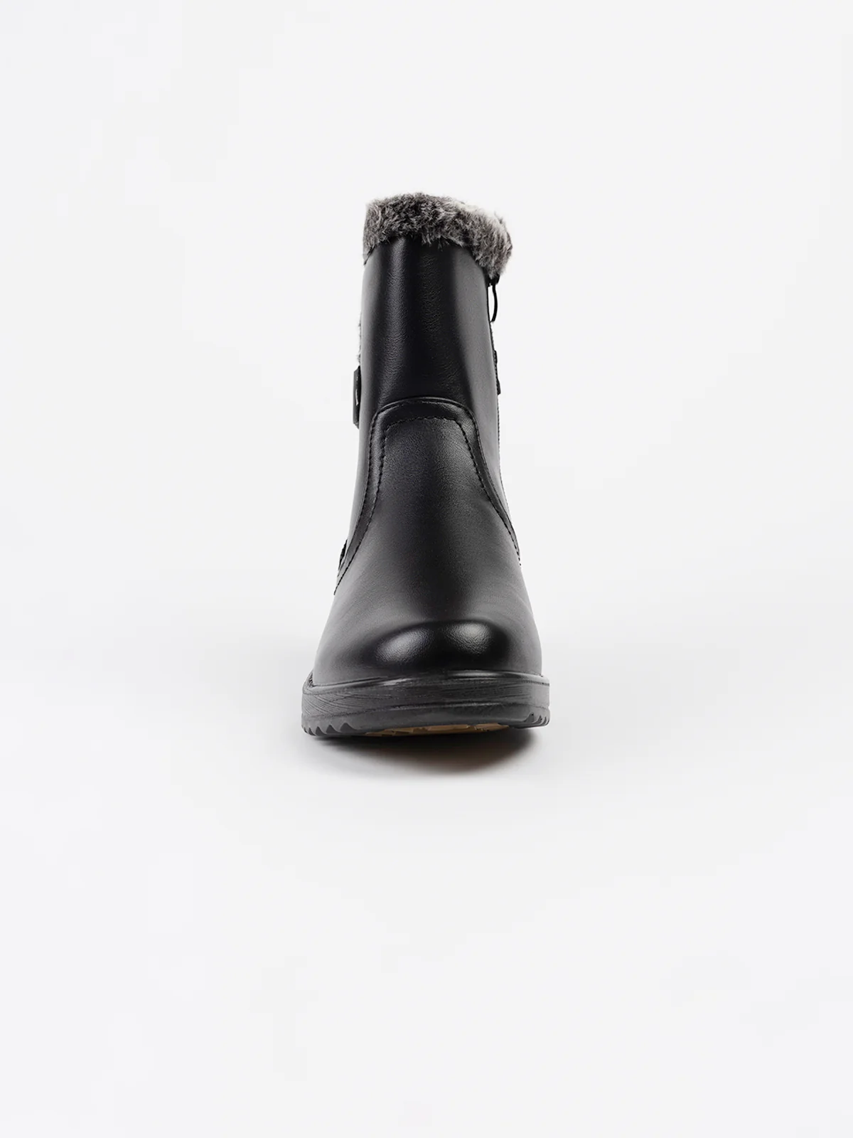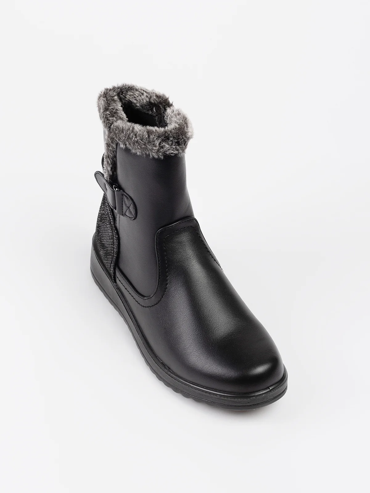 Bottes d’hiver à talons compensés, dotées d’un revers en fausse fourrure, d’une fermeture zippée latérale et d’un empiècement arrière texturé.