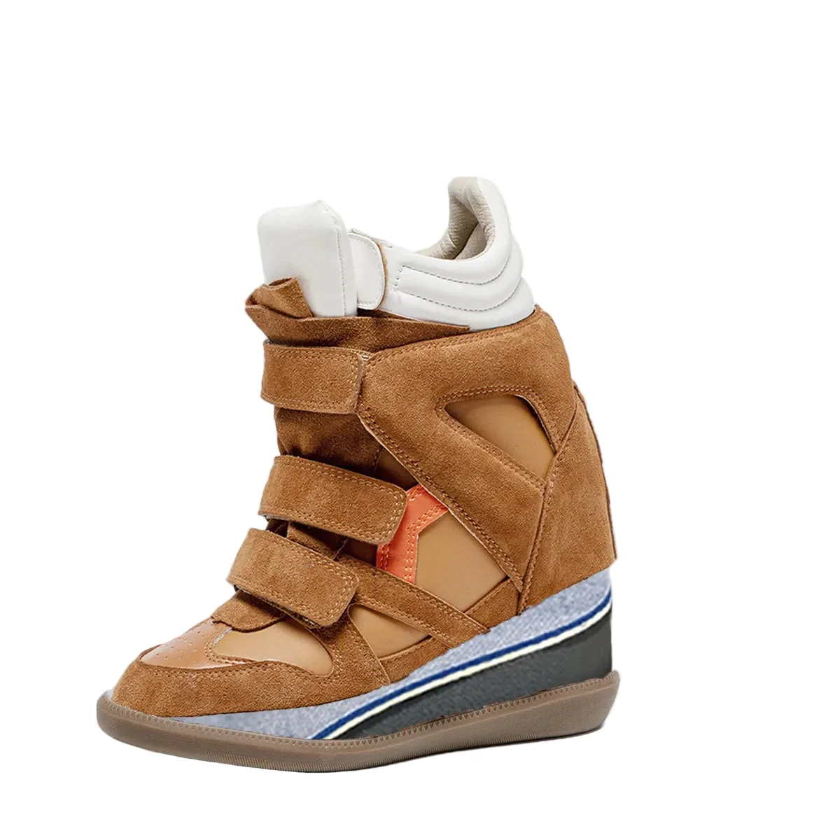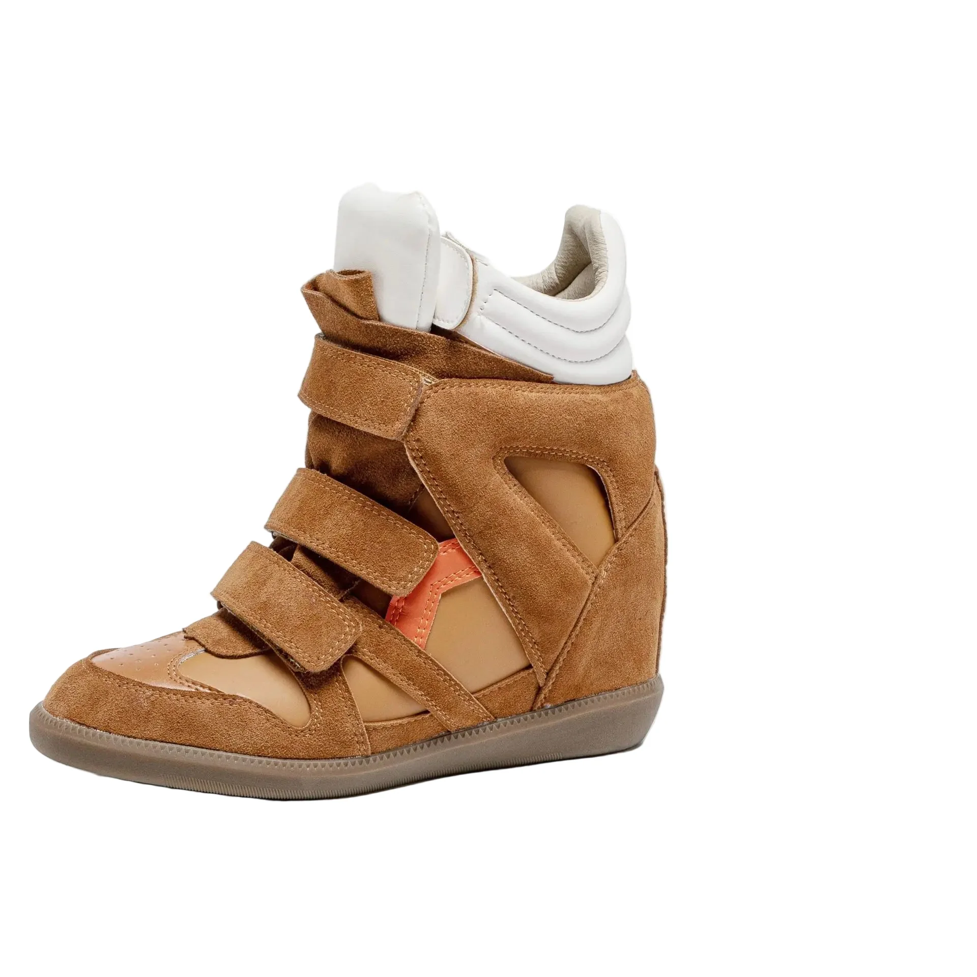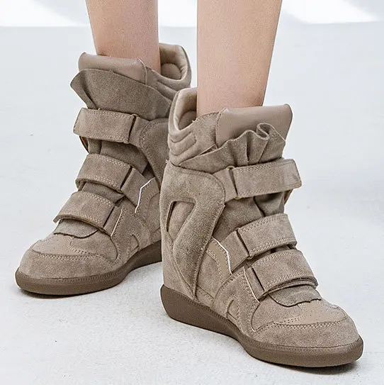 Bottines compensées intérieures +8cm hauteur secrète. Fermeture scratch magic tape enfilage facile rapide. Semelle caoutchouc durable antidérapante. Cuir peau porc + matériaux spéciaux confort. Bout rond élégant spacieux. Toutes saisons adaptées. Petites tailles disponibles. Style professionnel casual polyvalent.