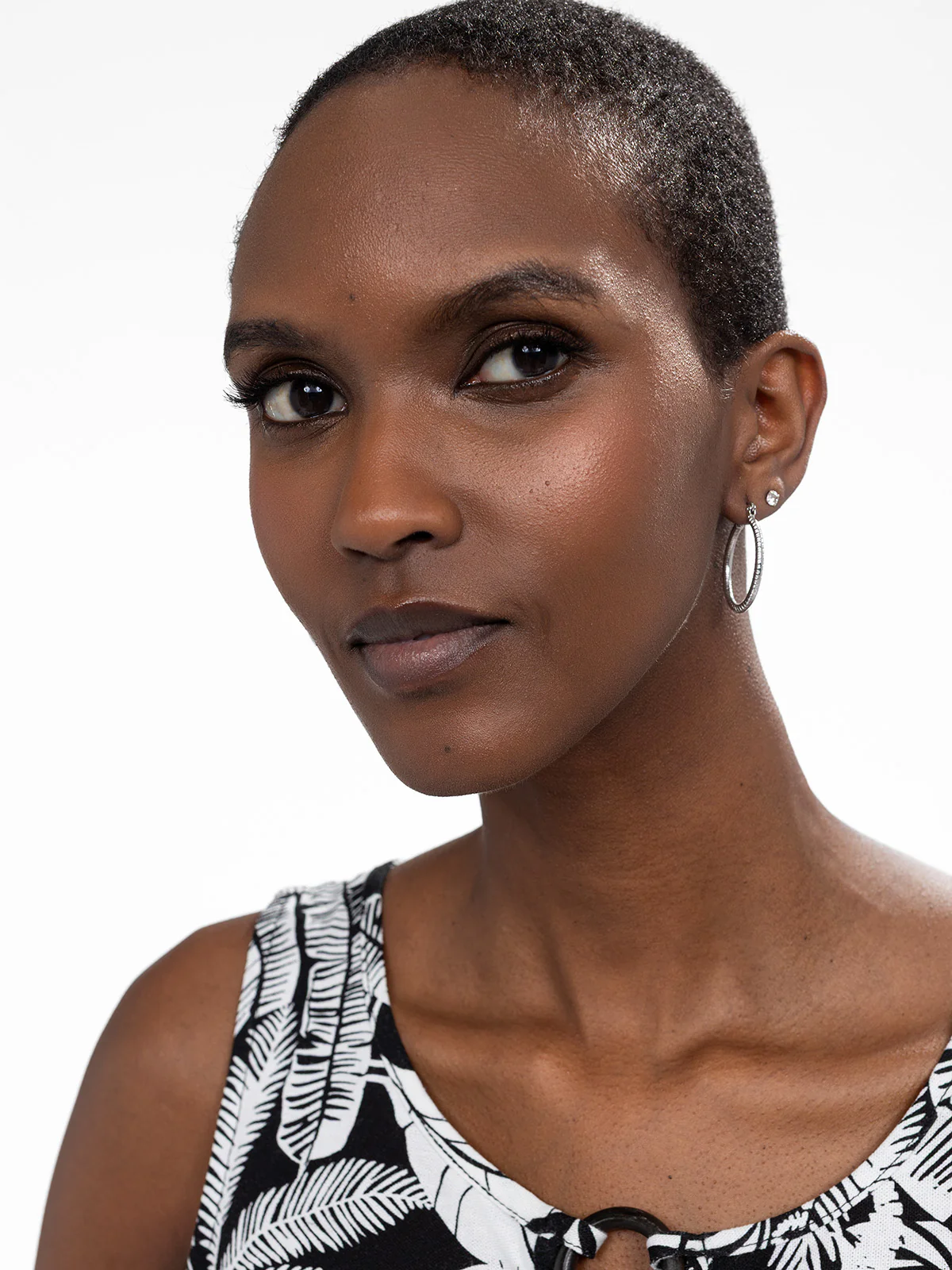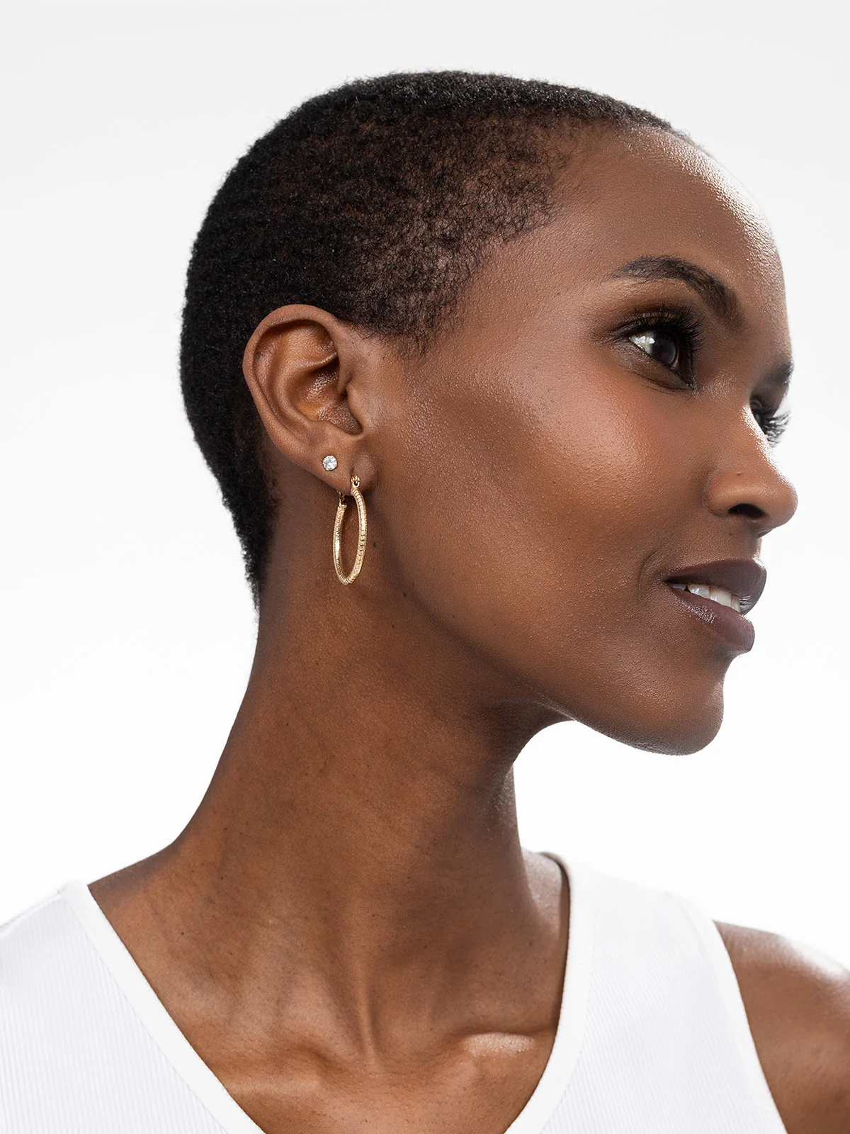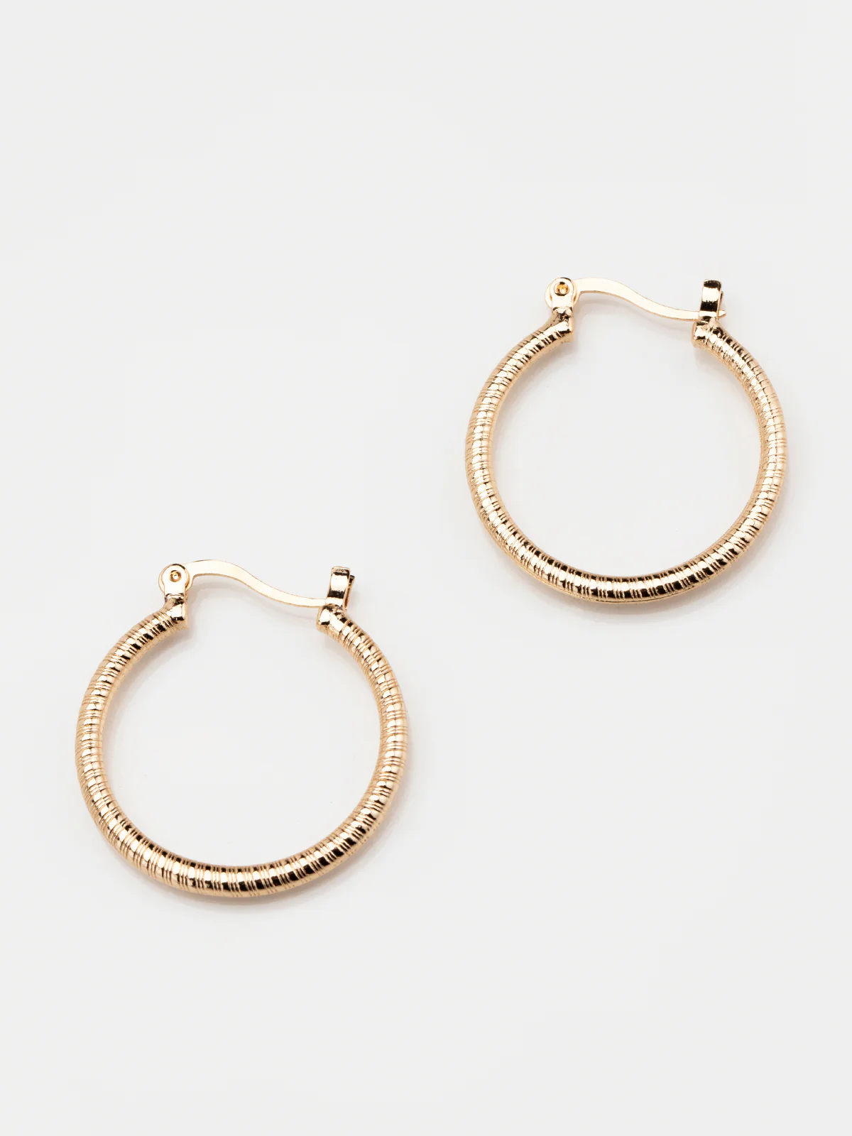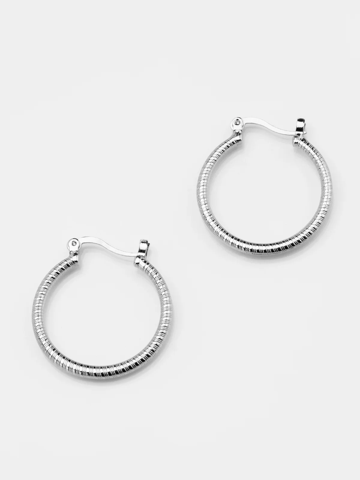 Anneaux texturés avec finition métallique, disponibles en argenté ou doré. Fermoir à charnière intégré.