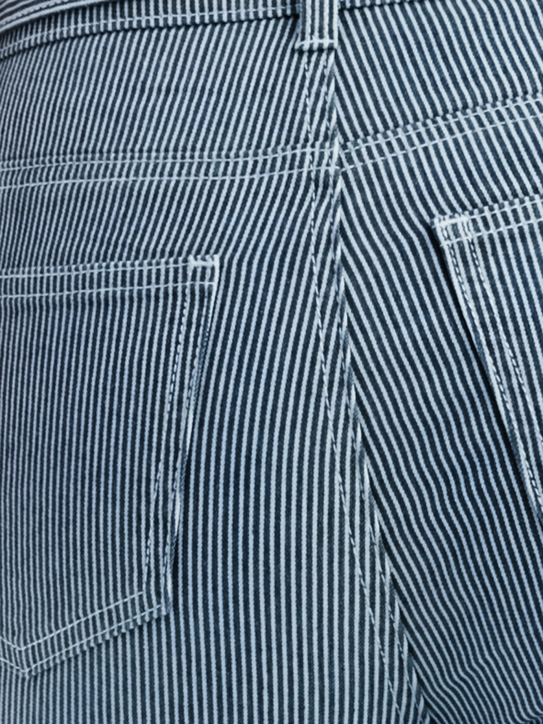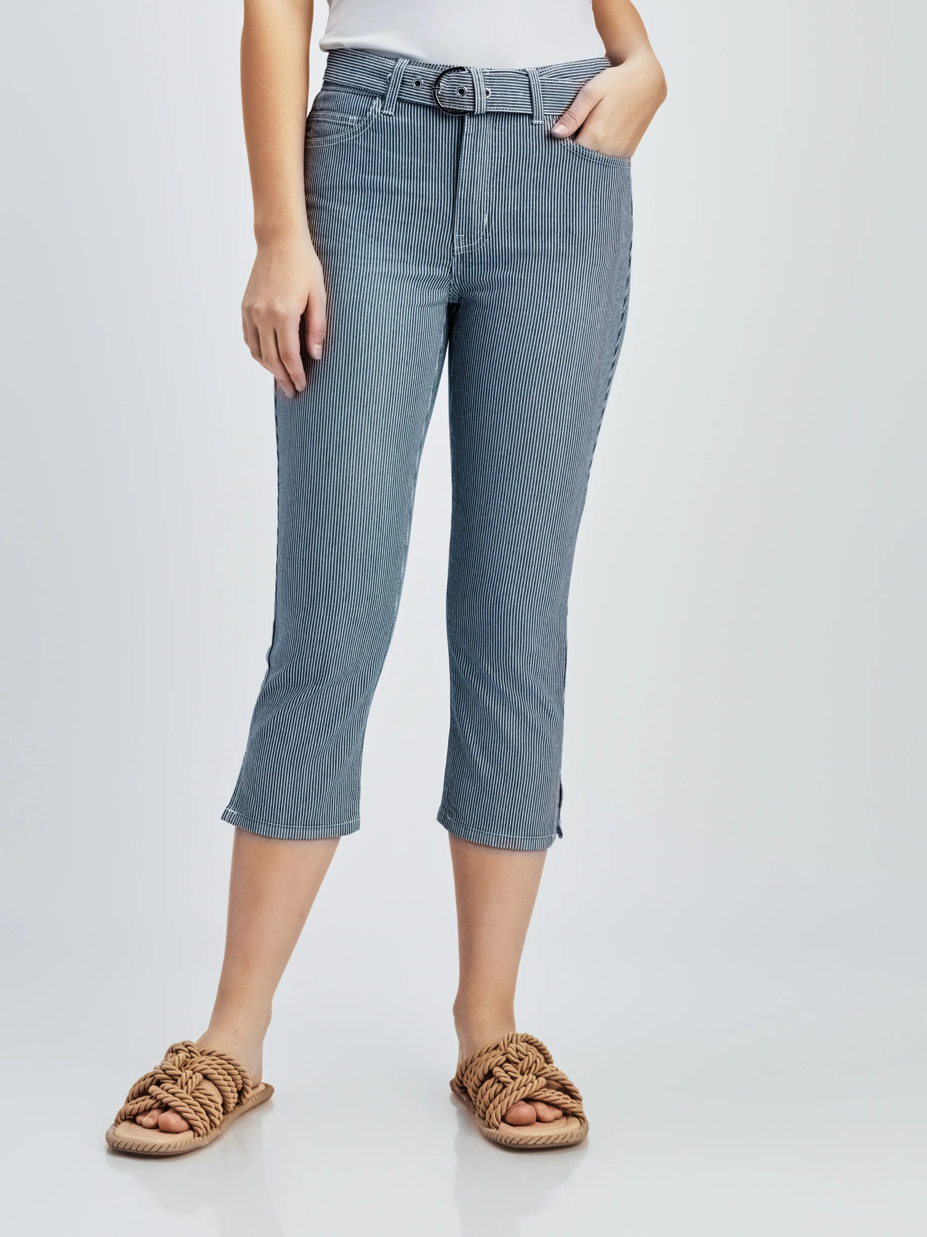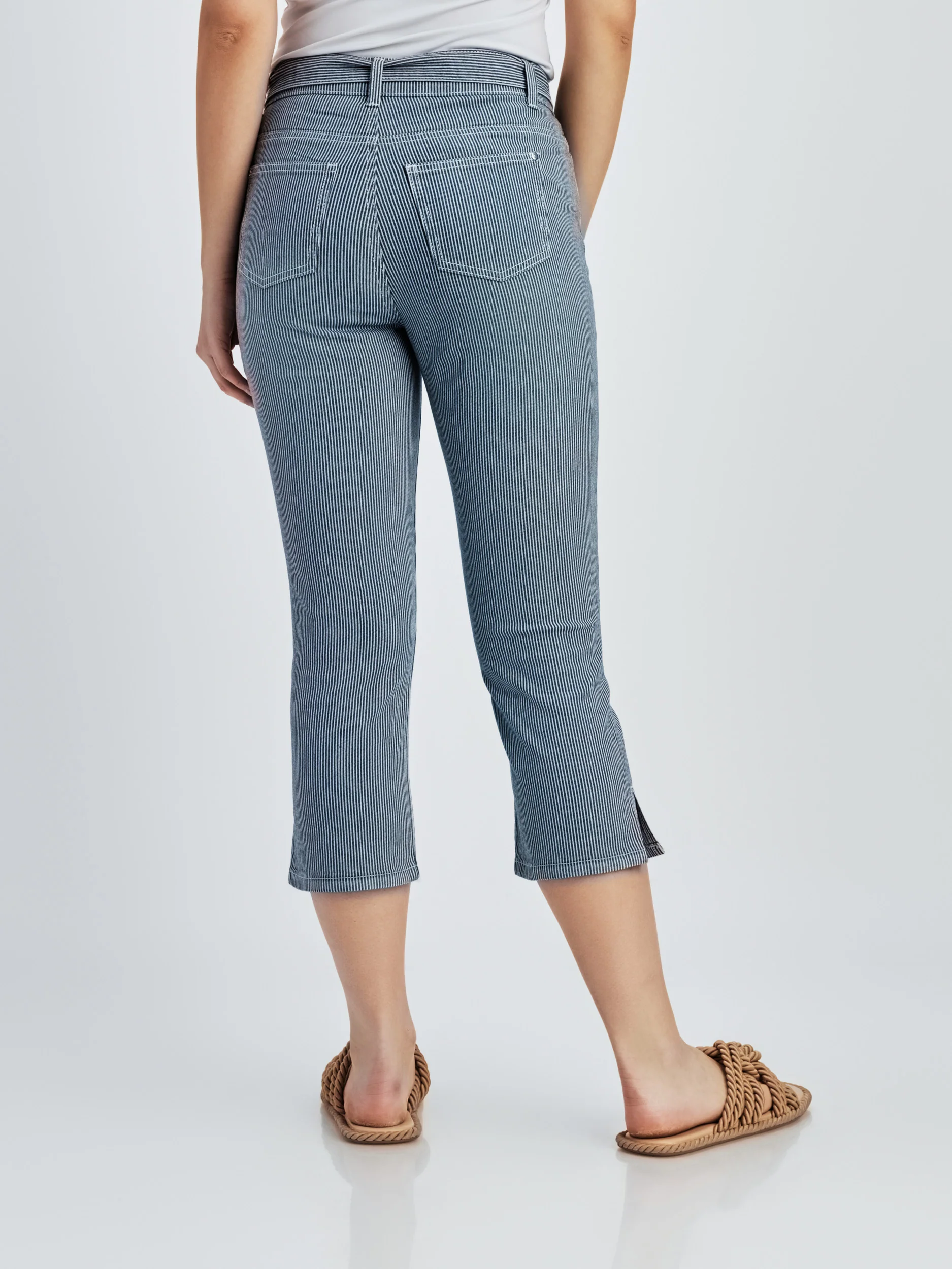 Ce capri à la jambe droite présente de fines rayures, le style classique à cinq poches est doté d’une ceinture.