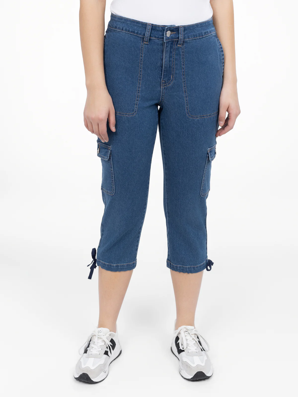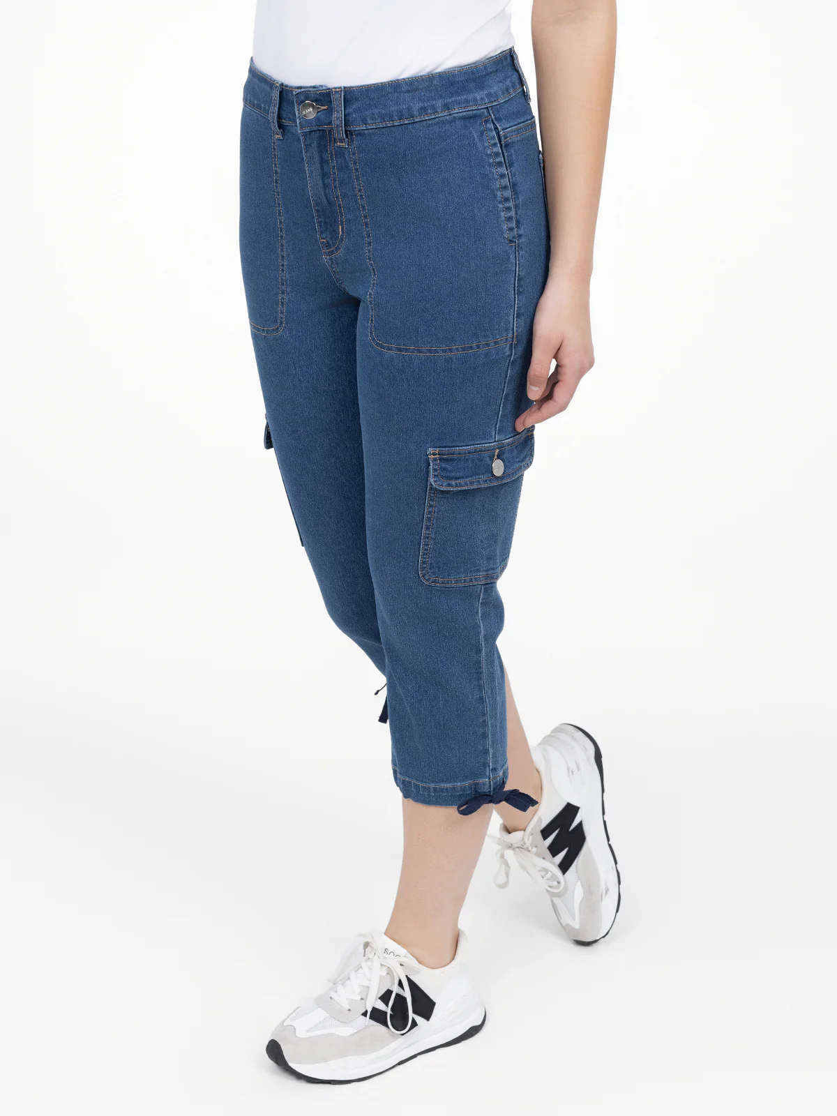 Capri droit en denim, doté de poches plaquées et de poches cargo latérales à rabat. Les ourlets ajustables avec liens noués ajoutent une touche pratique.