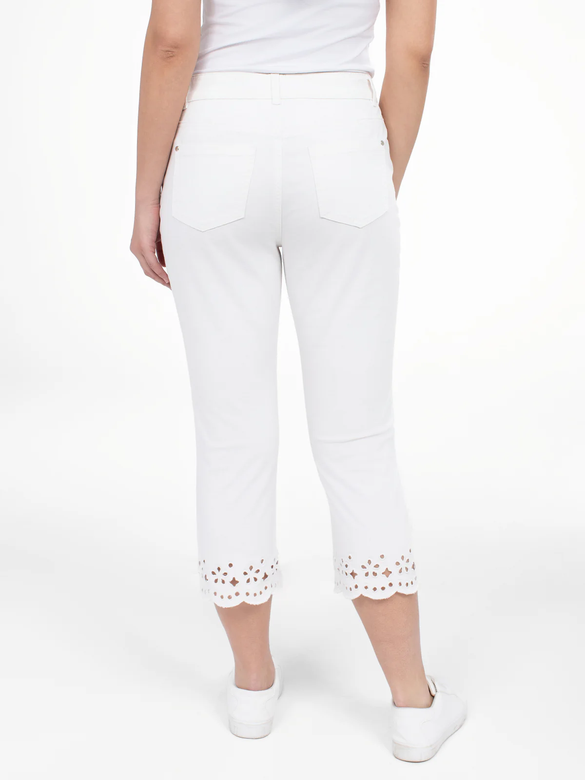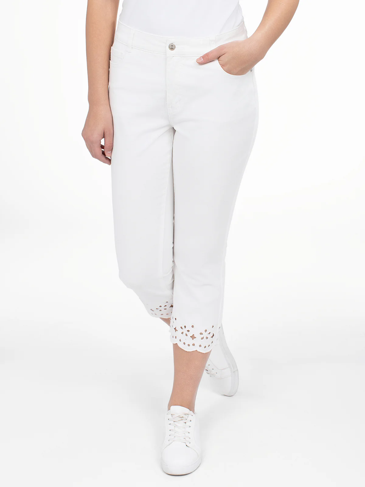Ce capri longueur mollet adopte une coupe droite flatteuse, ponctuée d’élégantes broderies ajourées au bas. Ses poches avant et arrière offrent praticité et équilibre visuel.