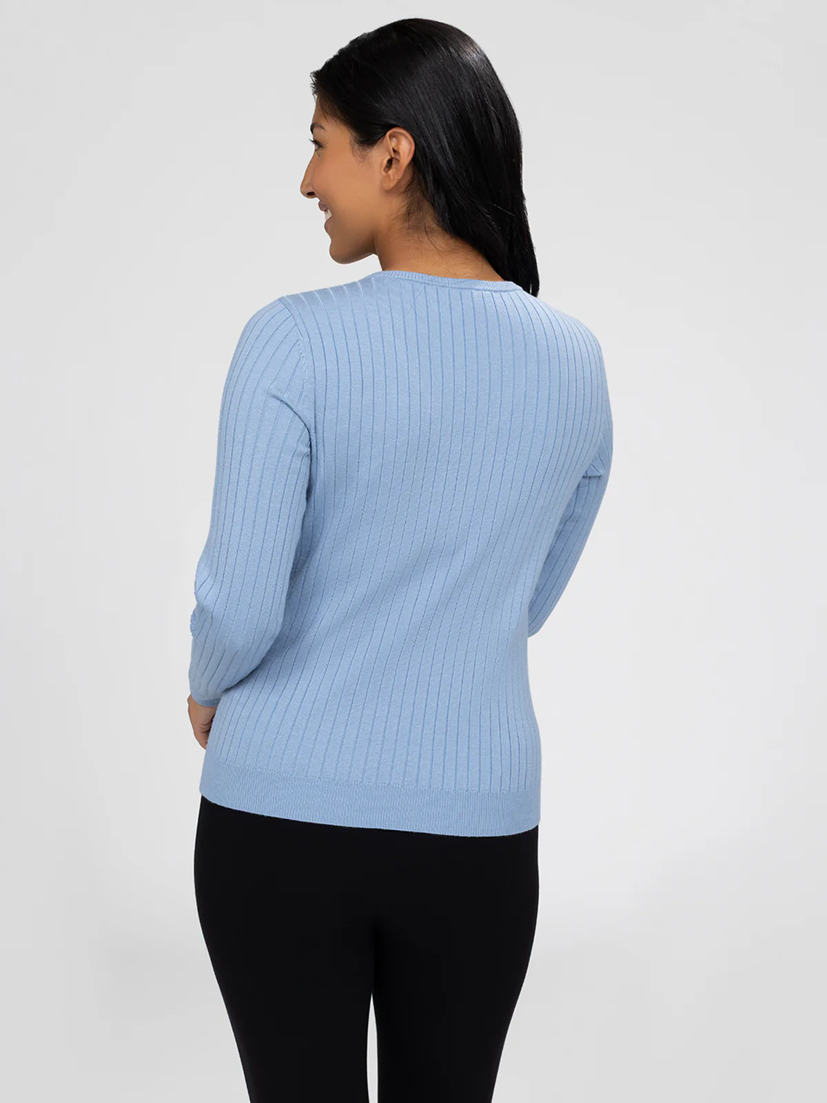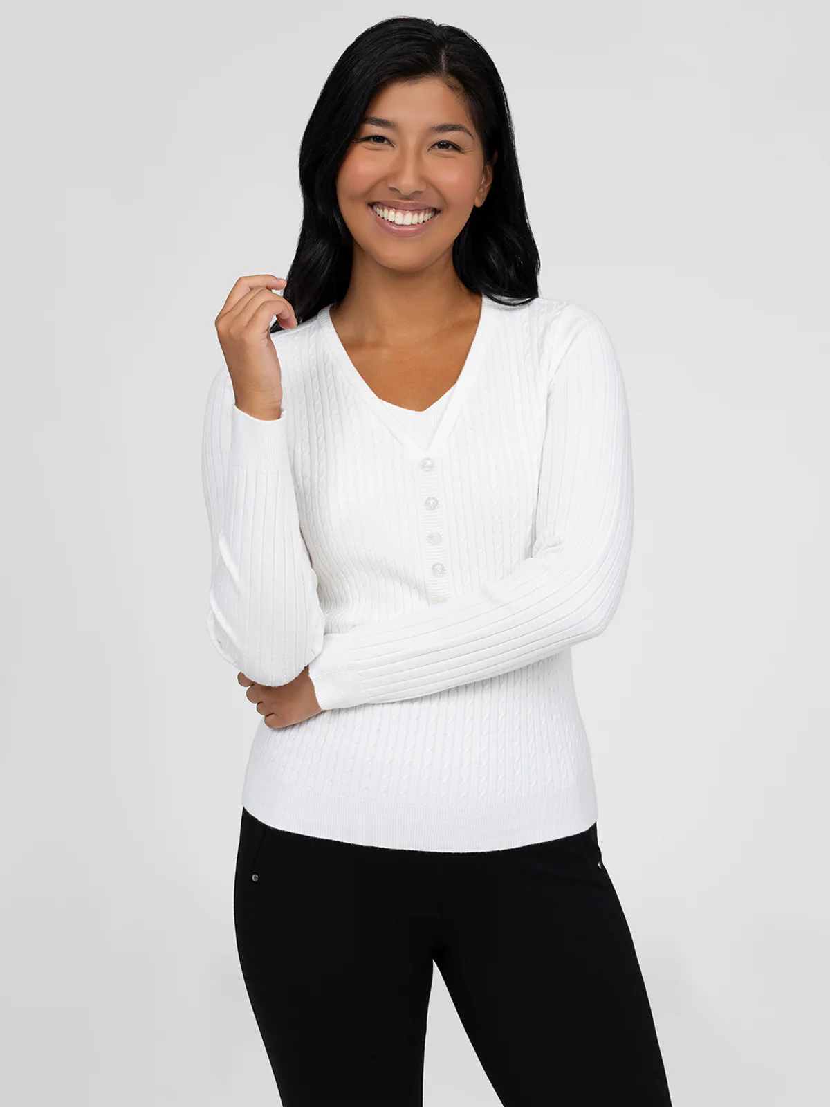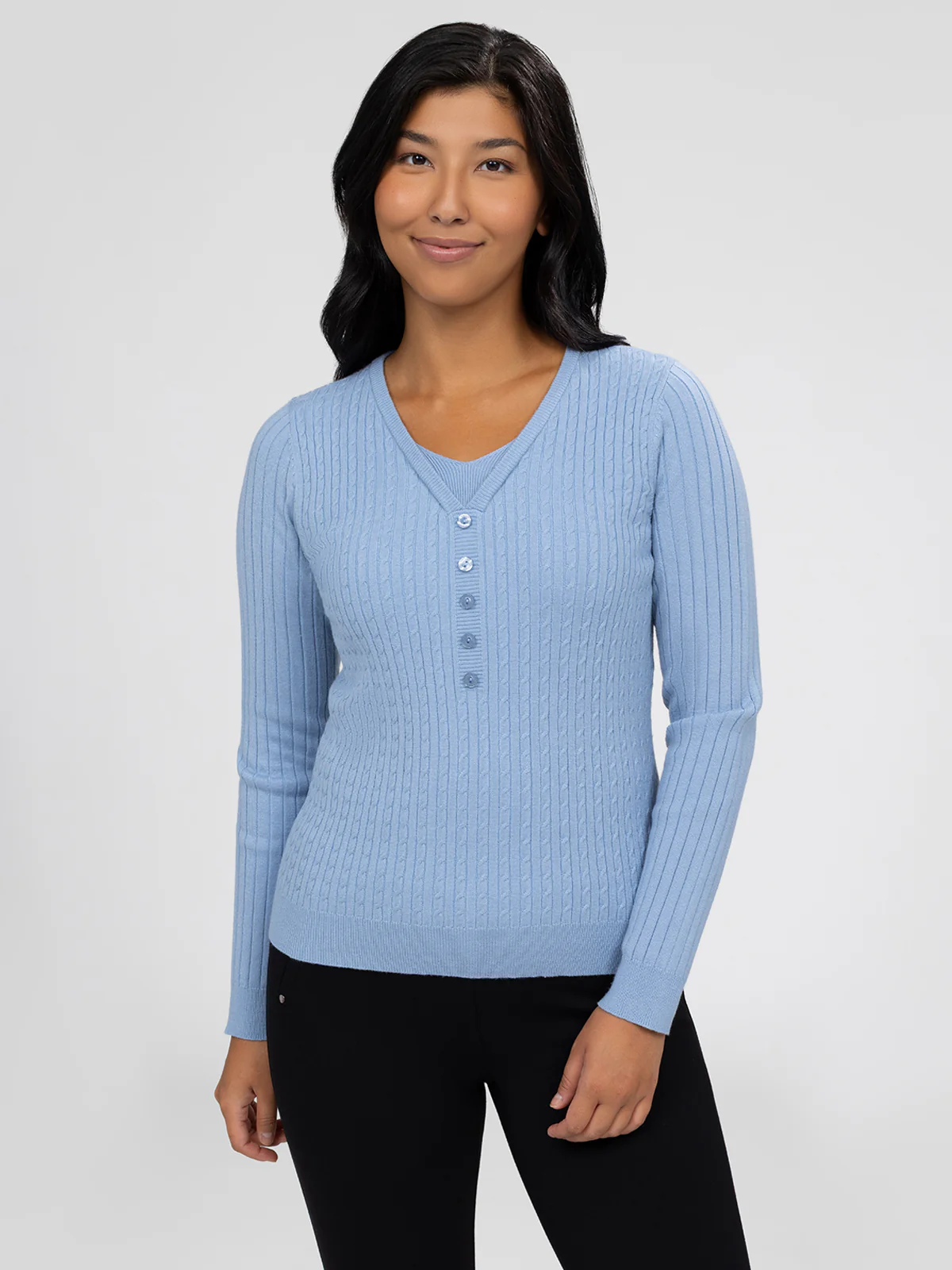 Chandail à manches longues en tricot côtelé avec encolure en V. Patte de boutonnage courte avec cinq boutons centrés à l’avant.
