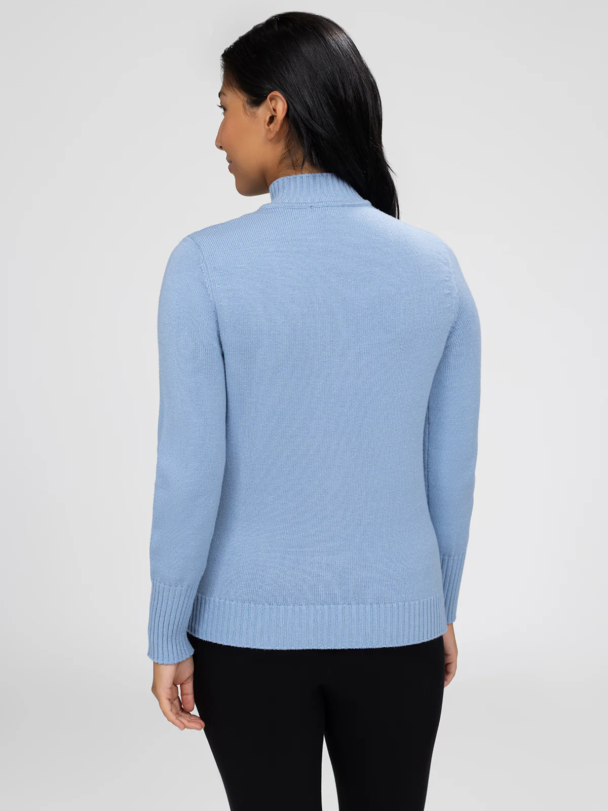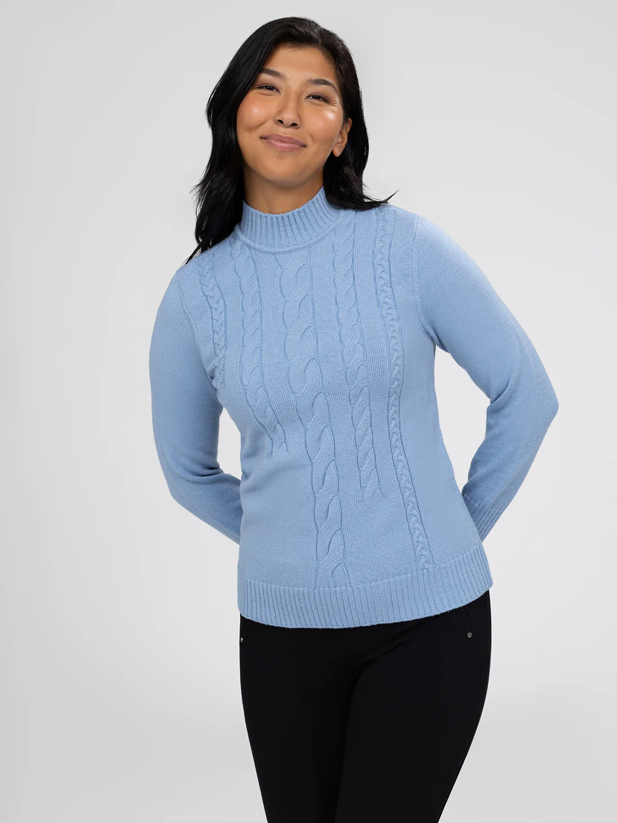 Chandail ajusté avec manches longues et col cheminée en maille côtelée. Le devant présente des torsades verticales, le dos est uni.