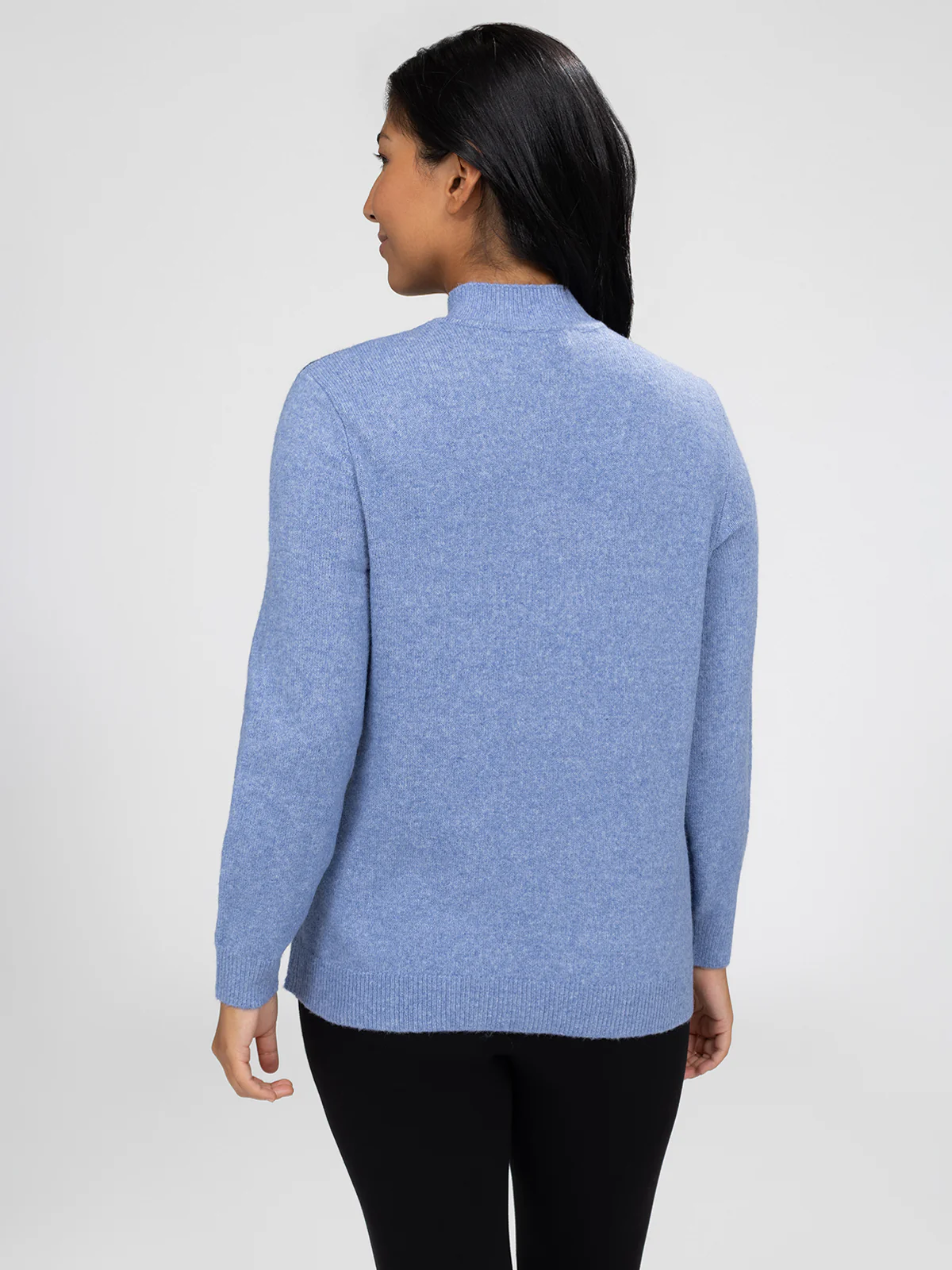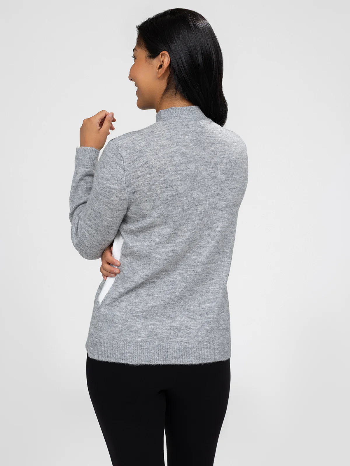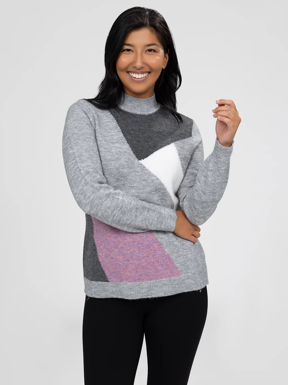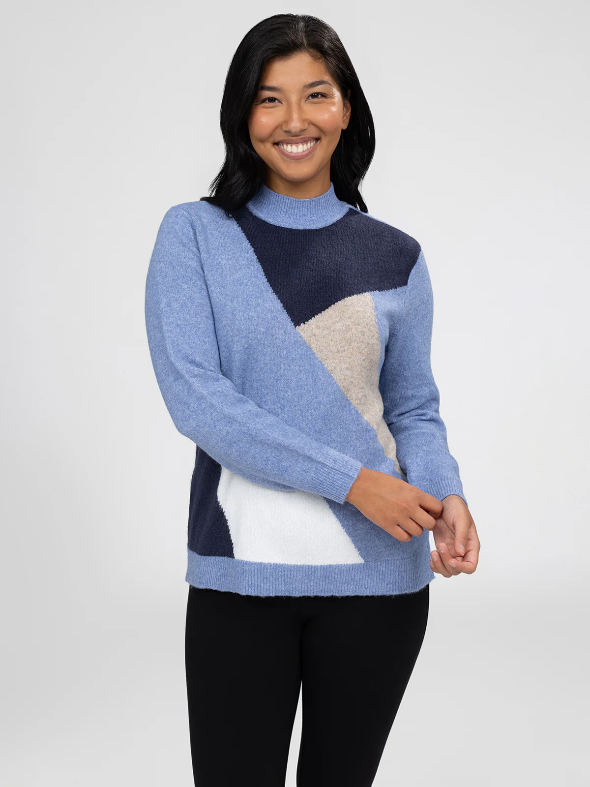 Pull à manches longues avec col montant côtelé et finitions droites. Le devant est composé de plusieurs zones de couleur agencées en formes géométriques, le dos est sans motif.