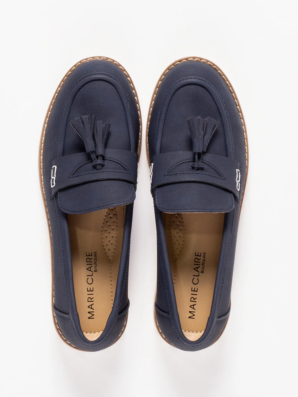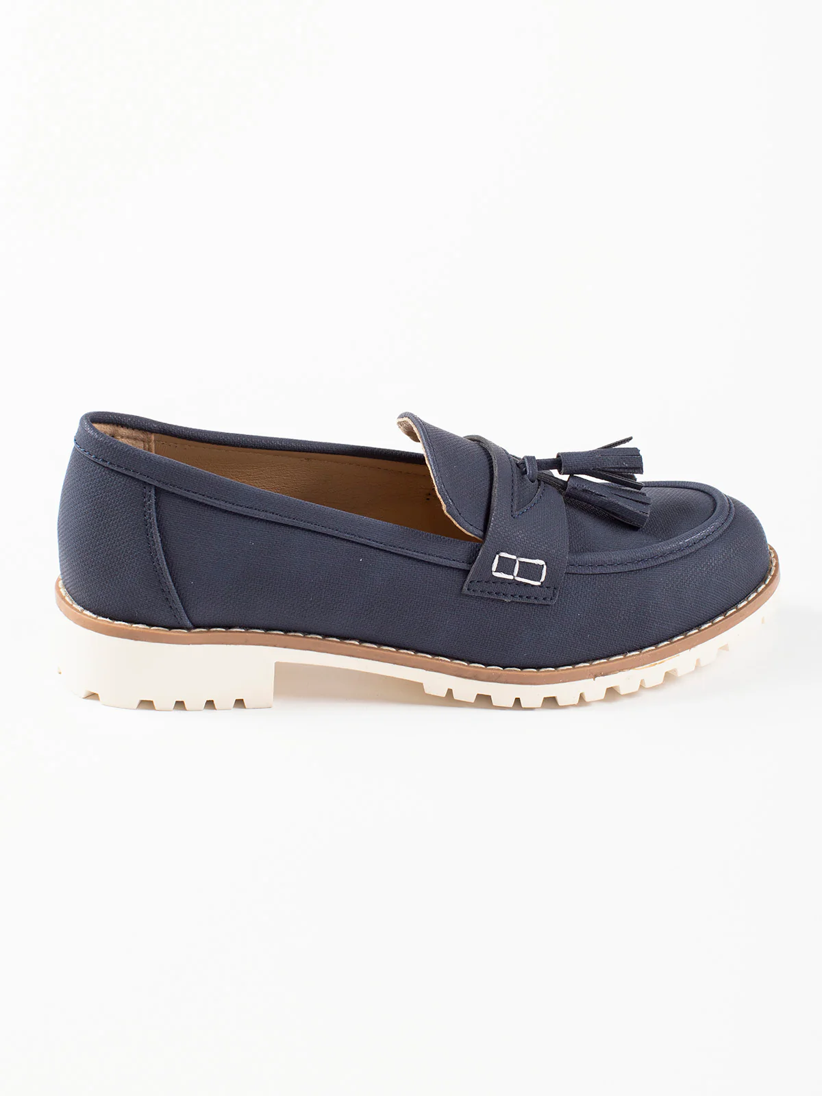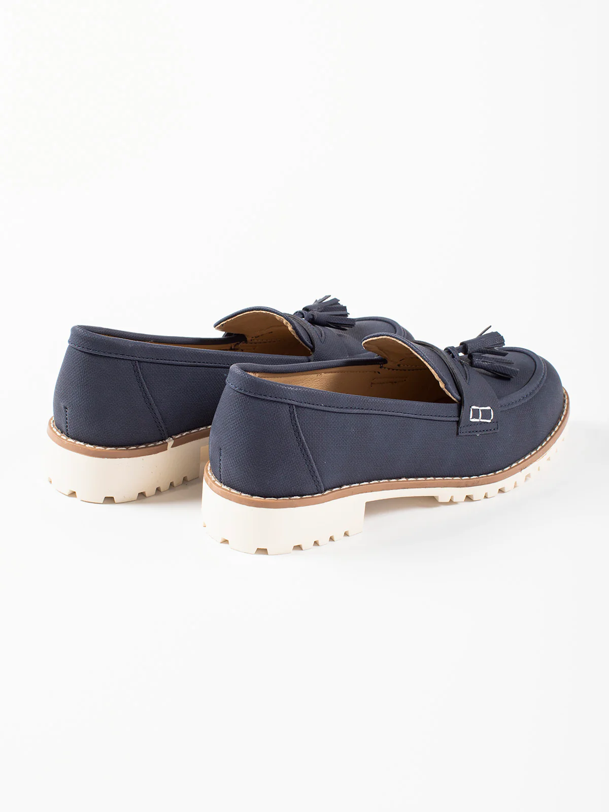 Mocassins en toile texturée bleu marine, animés d’un duo de pampilles sur l’empeigne. Semelle épaisse crantée en contraste clair avec surpiqûres visibles sur le pourtour.