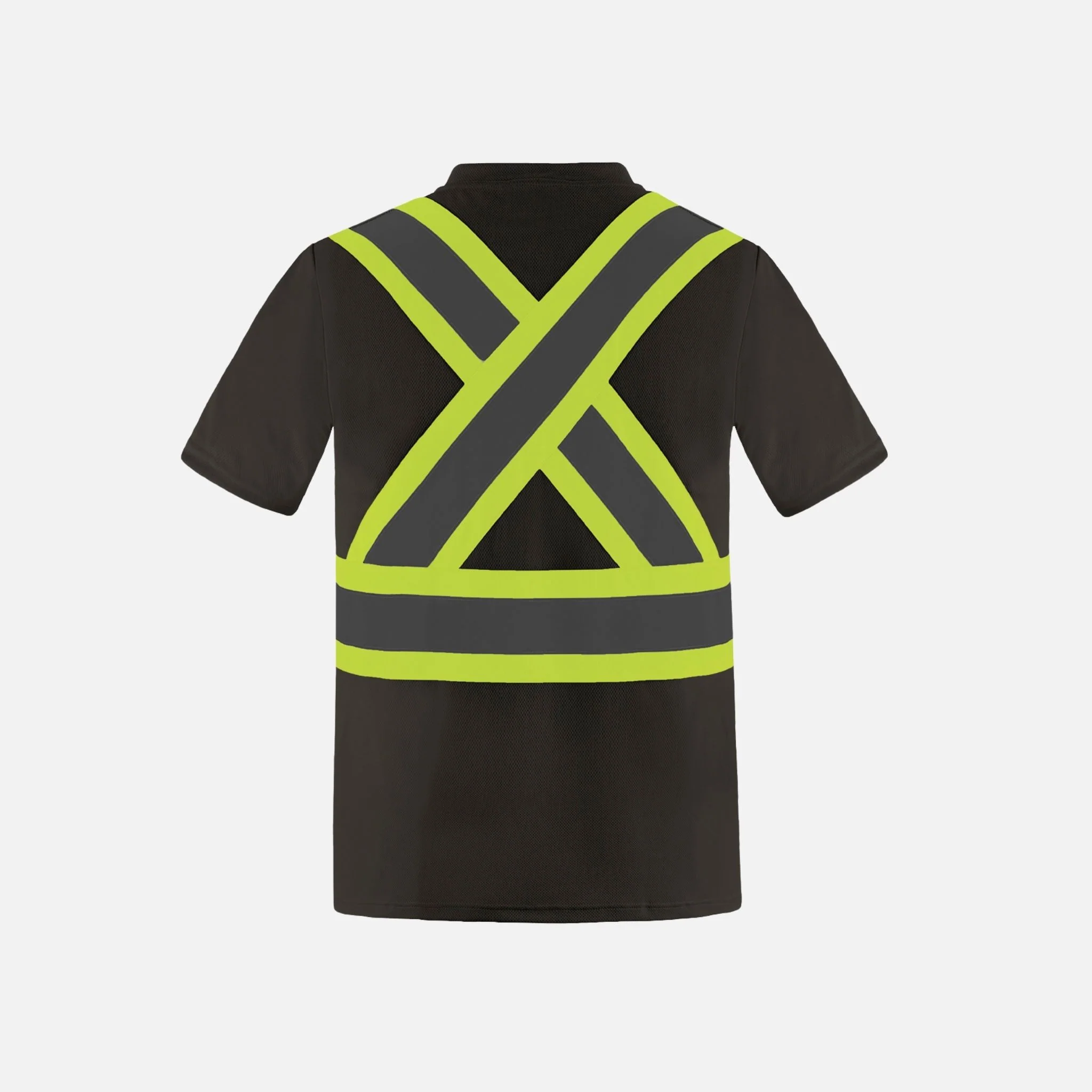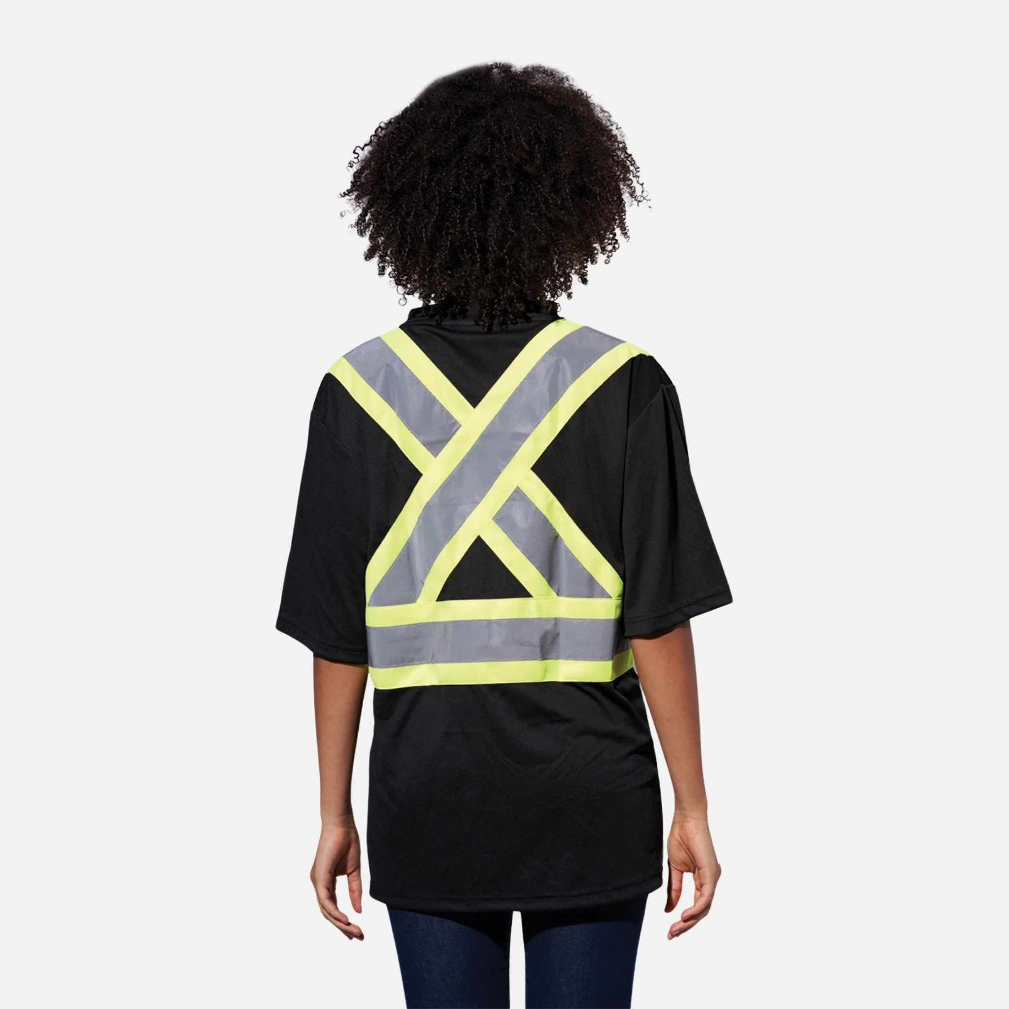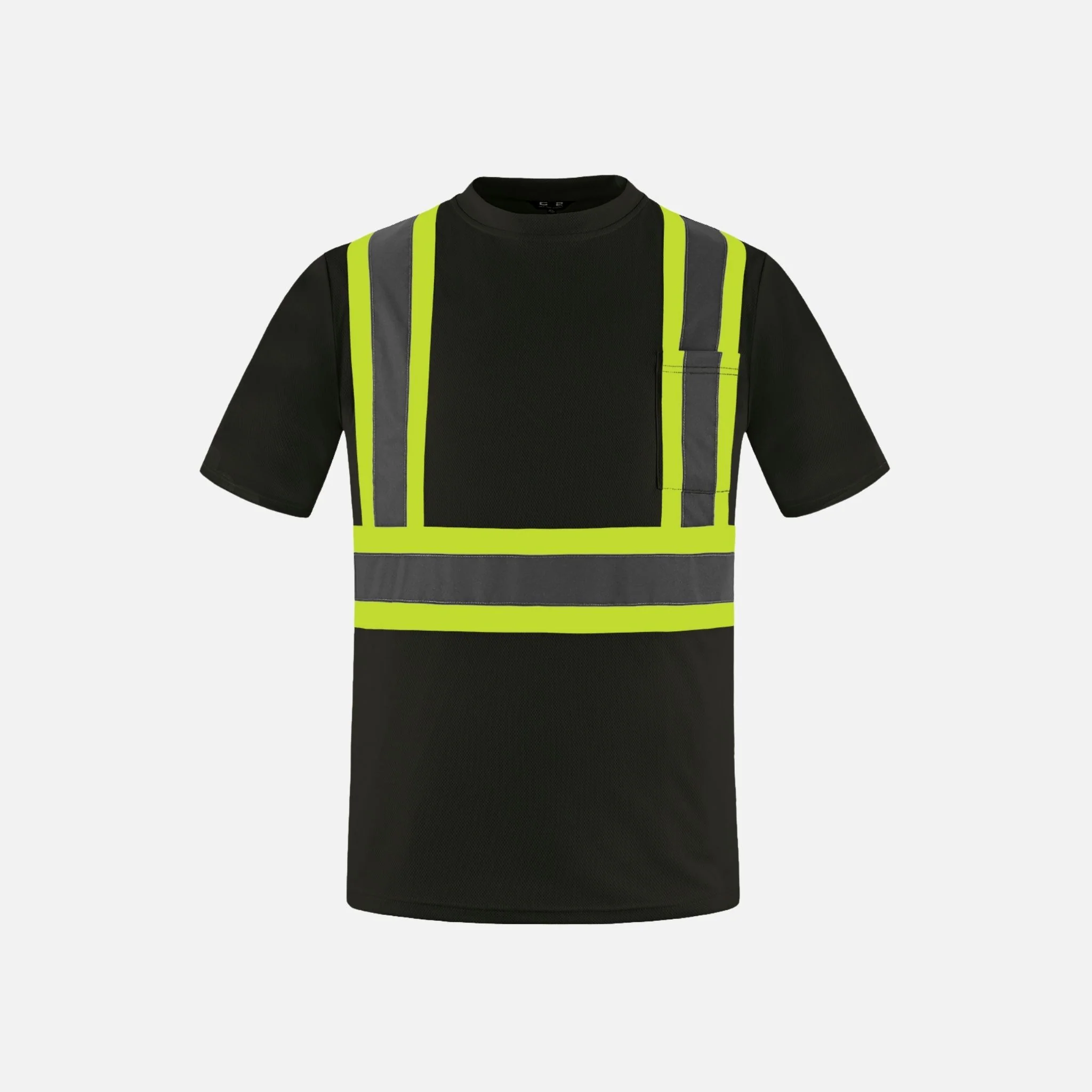- Bandes contrastées 4 po + ruban réfléchissant 2 po : visibilité avant/dos conforme aux normes CSA, avec poche poitrine.